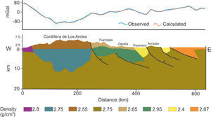 We employ a software that uses fast Fourier transform (FFT) to compute the geological model response (Popowski et al. (2006). For this, all grids must be expanded in size and filled so they are periodic and eliminate edge effects (Blakely, 1995). Each layer is assigned density values (Table 1). The basement was assigned a value of 2.7g/cm3 by extrapolating values obtained from seismologic studies by (Regnier et al., 1994) for the Pie de Palo Range and the San Juan Precordillera. The values used for the crust and upper mantle are standard values used in previous studies by: Introcaso and Pacino (1988); Introcaso et al. (1992); Martinez and Introcaso (1999); Giménez et al. (2000).