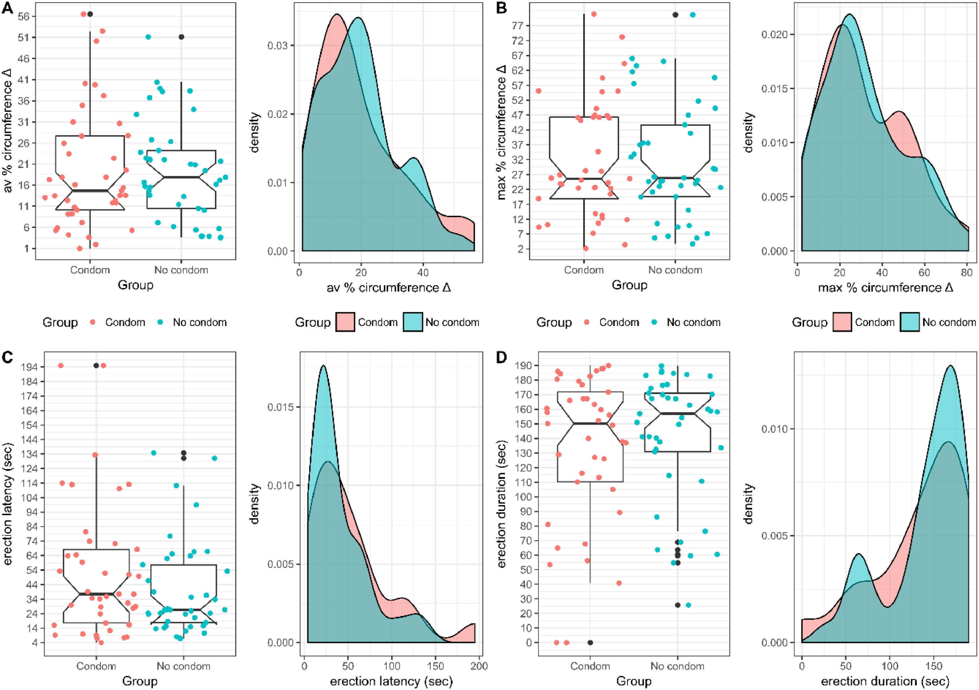 The erection was conceptualized based on four variables (average percentage of circumference increase, maximum percentage of circumference increase, erection latency, and erection duration) assessed during the experimental session (see the Methods section for more experimental details). Data analysis showed no significant differences between the groups (with and without condoms) and the erection variables: average percentage of circumference increase (Mann-Whitney U test; z = −0.450, p = .653, two-sided), maximum percentage of circumference increase (Mann-Whitney U test; z = −0.116, p = .908, two-sided), erection latency (Mann-Whitney U test; z = −1.275, p = .202, two-sided), and duration of erection (Mann-Whitney U test; z = −0.552, p = .581, two-sided). For further information, please refer to Fig. A.1.