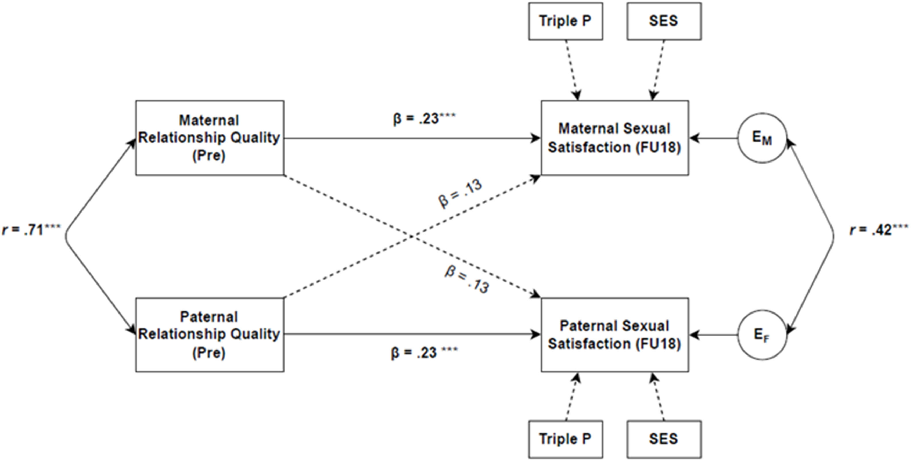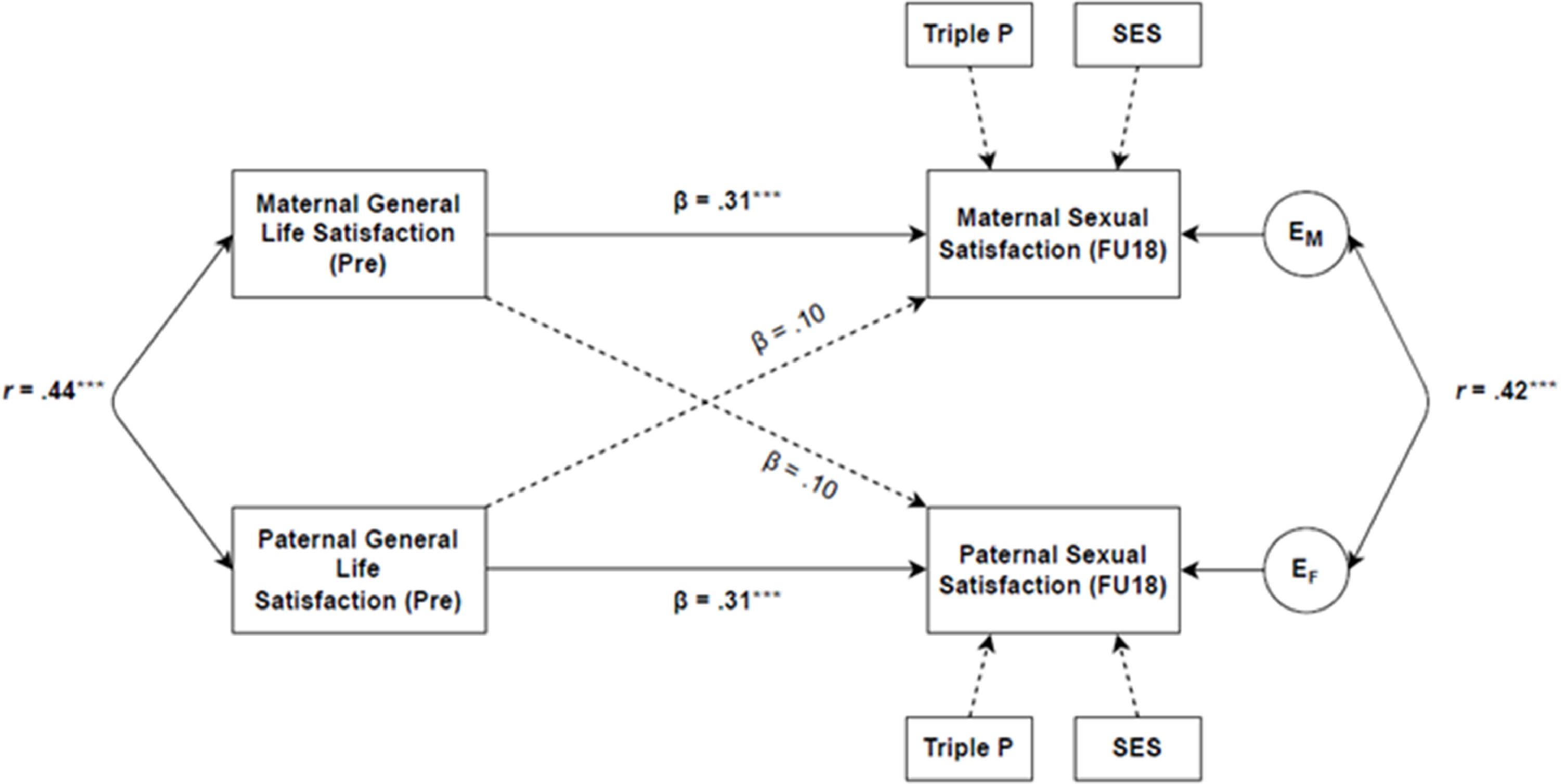 Means, standard deviations, and intercorrelations between men's and women's scores for all factors included in the analyses are presented in Table 1. A significant correlation was found between maternal and paternal sexual satisfaction. Furthermore, maternal and paternal sexual satisfaction at FU18 were significantly associated with mothers’ and fathers’ relationship quality, mothers’ mental health problems, as well as mothers’ and fathers’ general life satisfaction at Pre (see Table 1 for the specific correlations). Paired t-tests only revealed a significant difference between maternal (M = 60.39, SD = 30.77) and paternal general life satisfaction (M = 54.52, SD = 32.17) at Pre (t (141) = 2.19, p = .030, d = 0.18).