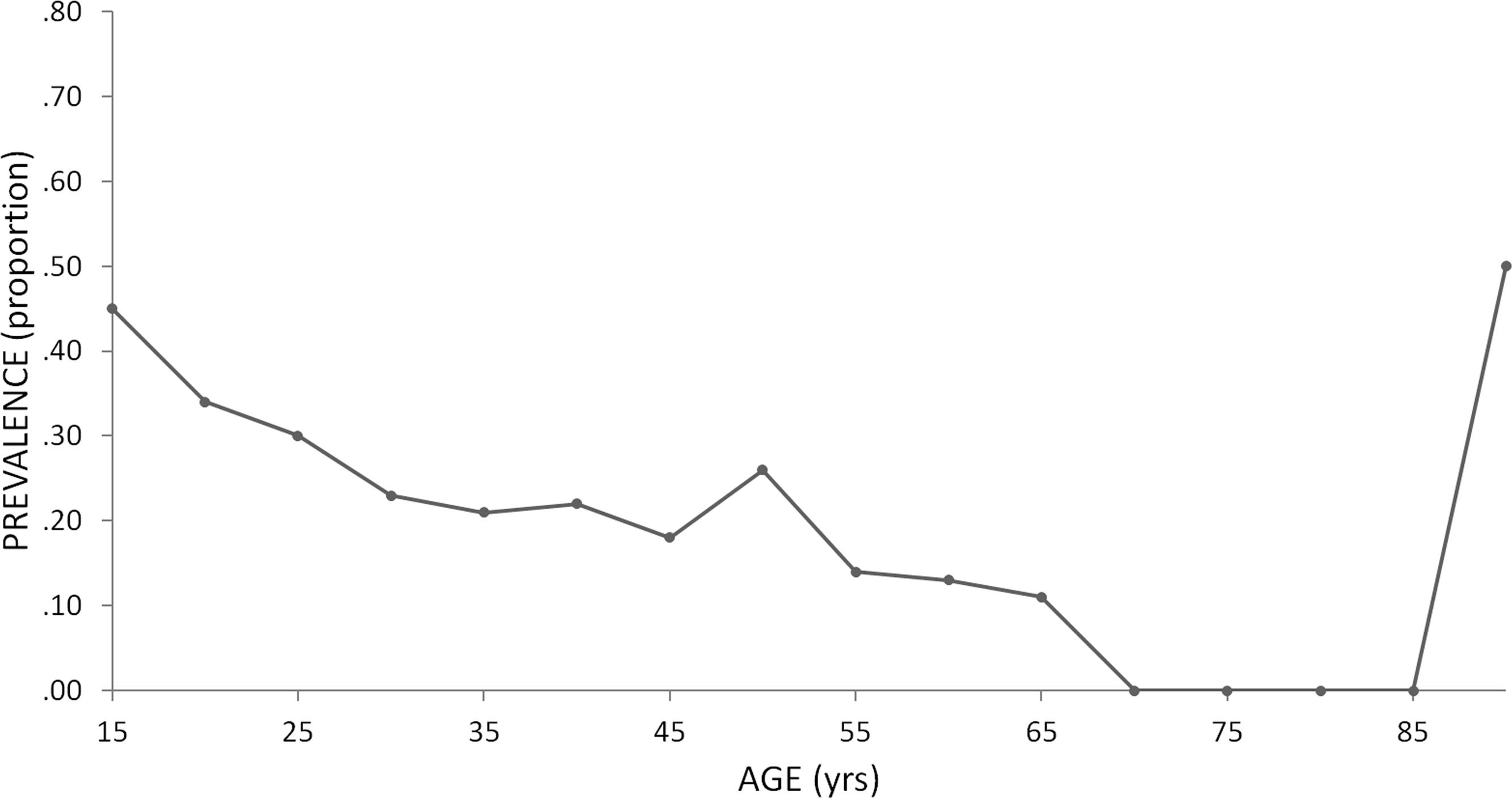 The results of this study generally support the validity of the extended childhood disorder concept, although the study should be considered exploratory. It is notable, for example, that the prevalence of ECD in the present sample (45.8 %, ages 15 to 18) roughly matches the most recent National Comorbidity Survey estimate (49.5 %), using DSM-IV criteria, of the prevalence of teen disorders in the U.S. (Merikangas et al., 2010). It is also notable that ECDI test scores were significantly predictive of 13 self-reported criterion variables, among them clinically important variables such as hospitalization for mental health related problems, history of therapy, history of psychoactive medication, and levels of happiness, anger, depression, and anxiety. As one might expect, total scores on the ECDI were also significantly negatively correlated with age. In addition, the prevalence of the disorder, as indicated by the proportion of “present” outcomes, was higher at younger ages (Fig. 1).