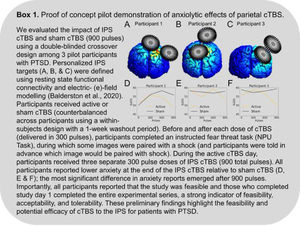 ConclusionsThe IPS is a connectivity hub for anxiety-related arousal due to its role in orienting, attention, salience-detection, reward processing, vigilance. This region has promise for reducing anxious arousal and hyper-attention toward threat among patients with anxiety-related disorders. More research is needed to evaluate the effect of neuromodulation, specifically cTBS, to this region in larger, well-controlled clinical trials. Finally, more research is needed to evaluate whether neuromodulation to the IPS can augment response rates to existing evidence-based treatments for anxiety-related disorders, such as PE.
