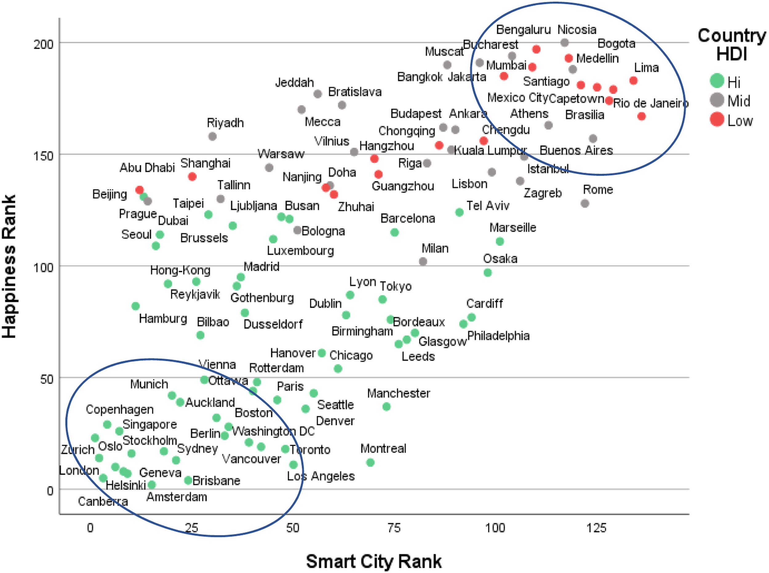 In our analysis we match cities that appeared in both listings, resulting in a total of 104 cities worldwide. Besides the available rankings in both indices and scores for happiness index, we manually extract 2.080 responses from the smart city index in order to separately calculate the score relevant for the technology pillar. For all these cities and respective countries also Human Development Index (HDI) was captured. After initial data preparation SPSS software was used to analyse the relationships between the rankings, individual scores and respective HDI. Cities were classified into three groups based on the HDI, namely high (>0.9), middle (between 0.8 and 0.9) and low HDI (lower than 0.7).