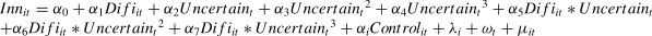 where Medit represents the mediating variables, including innovation capital agglomeration (Cap), entrepreneurial activity (Ent), and credit resource allocation (Credit). First, innovation capital agglomeration (Cap) is measured by the ratio of urban agglomeration R&D expenditure to national R&D expenditure. Second, entrepreneurial activity (Ent) is measured as the arithmetic average of the number of new businesses per 100 people in a city. Third, as an inverse proxy for credit resource allocation, regional credit constraint is measured using the traditional financial development level index of each city (Credit). The higher the level of traditional financial development in urban agglomerations, the better the credit resource allocation and the fewer credit constraints enterprises face to innovate.Next, we examine whether economic policy uncertainty has a nonlinear moderating effect on the relationship between digital finance and innovation capacity, as it is an important environmental factor affecting the digital economy and regional innovation (Zhou et al., 2023; Xu, 2020; He et al., 2020; Nguyen & Nguyen, 2023; Cheng & Masron, 2023). We construct the following nonlinear moderating model. First, based on model (1), the squared term of economic policy uncertainty (Uncertaint2) and its cross-multiplier with digital finance (Difiit*Uncertaint2) are added to construct model (3). This model is used to test whether there is a “U-type” or “inverted U-type” nonlinear moderation effect of economic policy uncertainty. Then, the cubic term of economic policy uncertainty (Uncertaint3) and its cross-multiplier with digital finance (Difiit*Uncertaint3) are added to model (3), yielding model (4) which examines whether there is an “N-type” or “inverse N-type” nonlinear moderating effect of economic policy uncertainty.