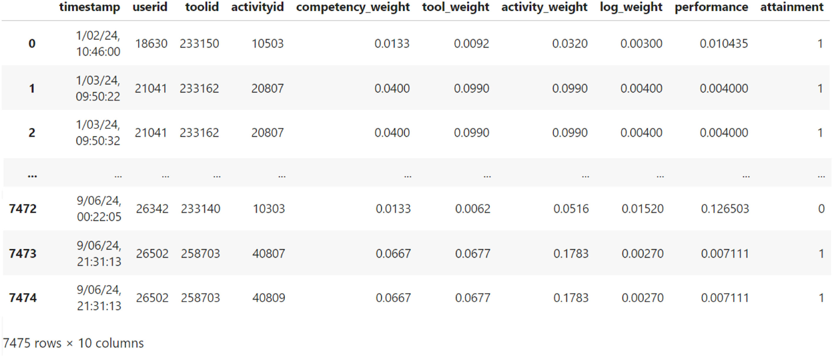 The efficiency of training performance Pid depends on the log weight, the activity performed and the tool used. This approach considers the priorities of features based on their influence. Therefore, the efficiency was estimated based on the weighted importance. The efficiency equation is a holistic framework that aims to understand the various elements contributing to efficiency; the efficiency score for each user can be calculated using Eq. (7):