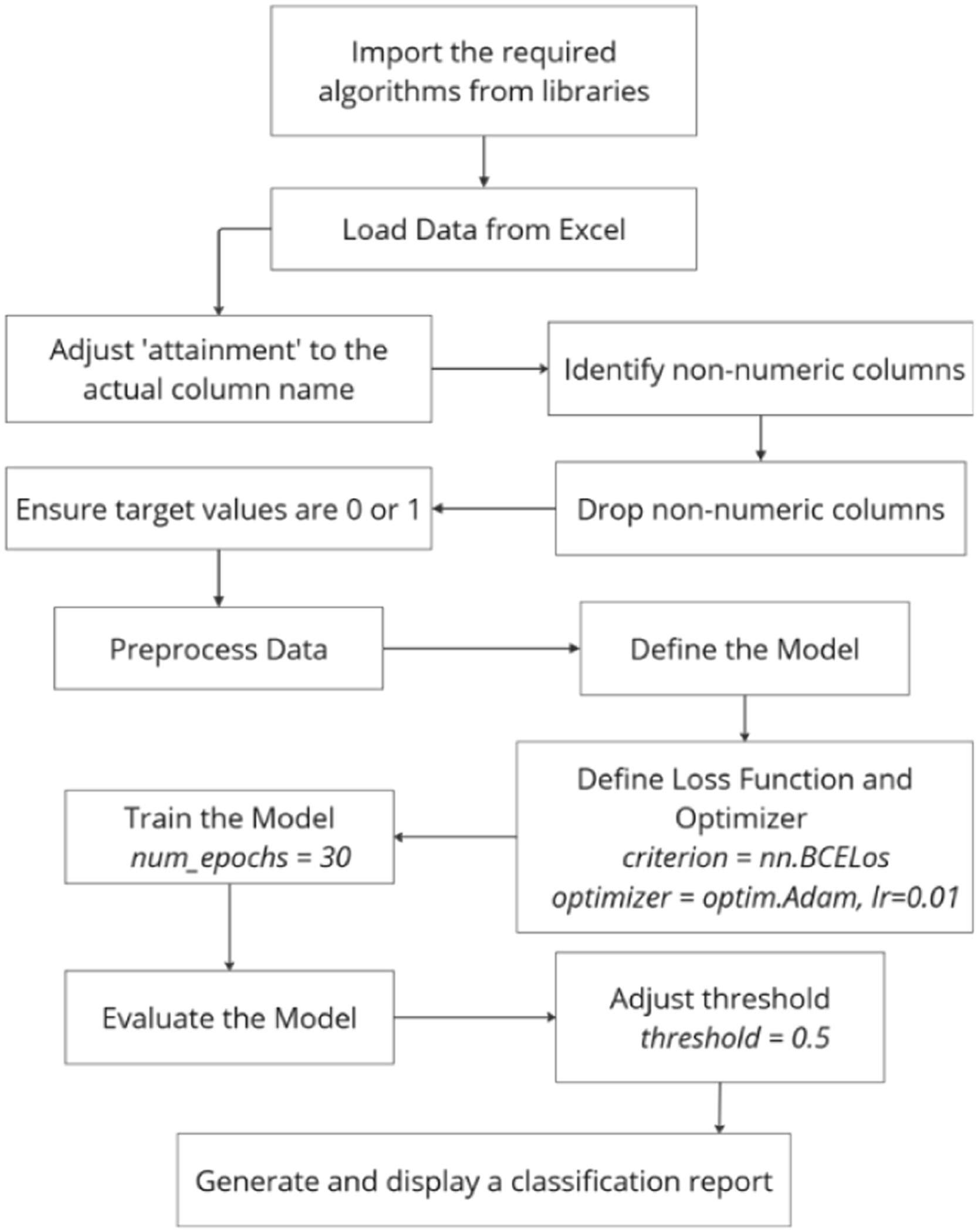 The selected hyperparameters are well suited for a typical deep-learning task involving binary classification. To train the data model, the ‘attainment’ column was used for prediction (Ovtsarenko, 2024c) - testing students’ success in using the proposed educational material with the teacher’s structure to use educational resources. Fig. 6 presents the Python algorithm scheme for Colab Notebook with a sequential description of the parts of the algorithm.