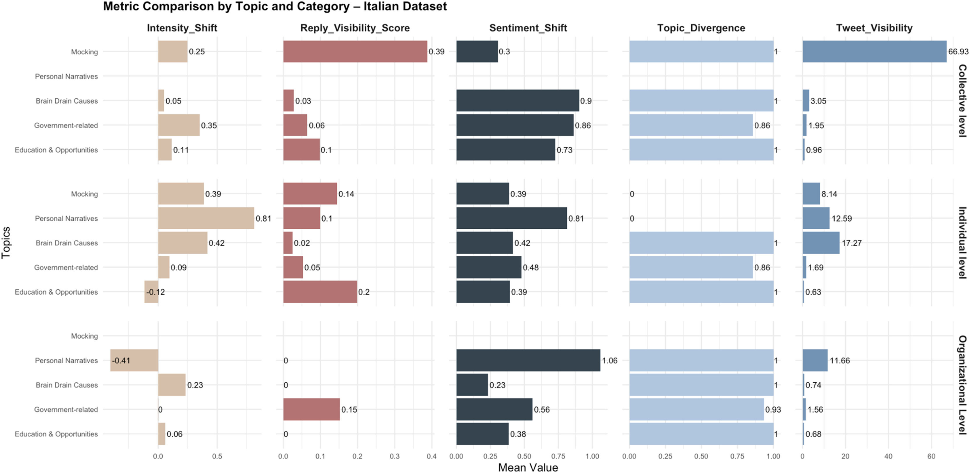 Fig. 5 presents a conceptual map of cross-linguistic engagement dynamics across three axes of conversational swing: emotional swing (absolute sentiment shift, measuring polarity contrasts between tweets and replies), thematic swing (thematic divergence, capturing topical drift between tweets and replies), and strength swing (intensity shift, reflecting changes in the magnitude of sentiment regardless of polarity). English publics exhibit high emotional and strength swings, reflecting sharp polarity contrasts and intensity modulation, but moderate thematic swings, consistent with collective coherence reinforced through emotional modulation. Spanish publics show low emotional and strength swings and the lowest thematic swing, reflecting expressive plurality across topics but coherence within reply threads. Italian publics show low emotional and strength swings but moderate thematic swings, reflecting consistent optimism in tone even when the topical focus shifts. Together, these axes illustrate how different cultural logics shape the discourse on brain drain on X: English through the emotional modulation of collective narratives, Spanish through plural yet coherent branching, and Italian through optimistic stability.