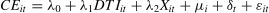where i and t represent the city and year, respectively. CEit indicates the development level of the CE. DTIit measures the level of digital technology innovation. Xit stands for the control variables, specifically the level of industrial enterprise development (IND), marketization level (MAL), foreign direct investment (FDI), government fiscal decentralization (GFD), and city size (CIS). μi is the city fixed effect, δt is the year fixed effect, and εit is the random error term.To mitigate potential endogeneity concerns, we employed the product of each city’s postal and telecommunications business volume in 1984 and its annual per capita telecommunications business revenue as an instrumental variable for digital technology innovation (Luo et al., 2024) and constructed a two-stage least squares (2SLS) regression model.