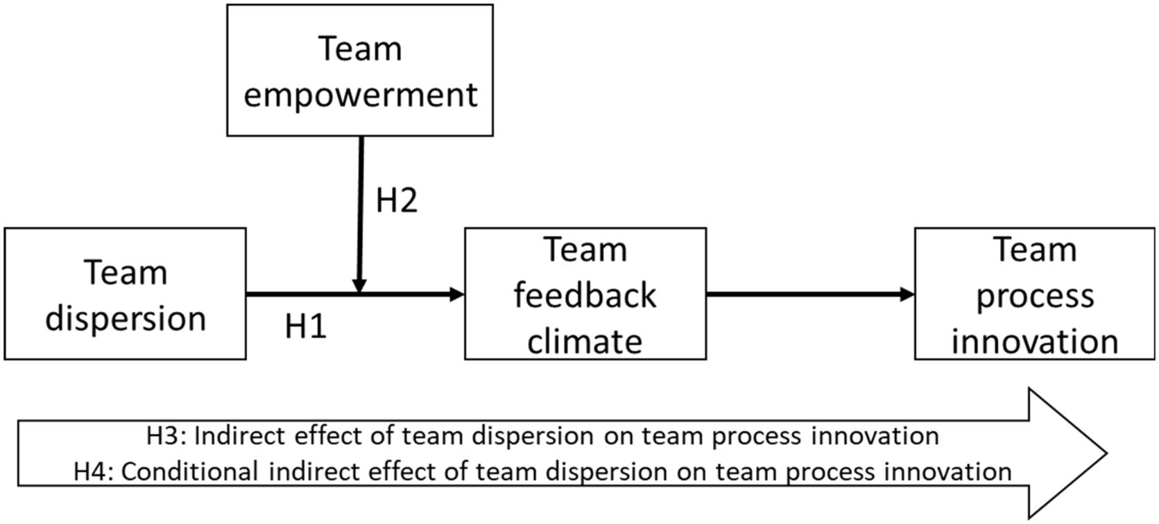 The ability of teams to achieve their goals can be traced back to the manner in which team members interact to ascertain the contextual situation in which are embedded, and to activate the knowledge of different team members (Handke et al., 2024). A feedback climate enables team members to acquire and apply relevant knowledge (Carter et al., 2019; DeShon et al., 2004; Geister et al., 2006) to make adjustments for future actions and strategies (e.g., Carter et al., 2019). This promotes the team’s ability to innovate the business processes. However, in a situation where team members are dispersed, the development of a feedback climate appears particularly challenging because individuals’ spontaneous interactions are limited, thus hampering team members’ ability to embrace innovative actions (Rafique et al., 2022). Dispersion of team members may affect team process innovation by hindering team members’ ability to develop a constructive feedback climate, which is pivotal for enabling team members to build new knowledge and guide their activities toward the goal. Moreover, as the effects of members’ dispersion on team feedback climate are contingent on the degree of control team members have in terms of empowerment, we expect that the relationship between team members’ dispersion and process innovation through feedback climate is moderated by team empowerment. Teams with a higher degree of empowerment are less likely to suffer the effect of dispersion on feedback climate, thus enabling team members to better activate feedback exchange processes that facilitate innovate. In other words, a high degree of empowerment decreases the potential misalignment among team members, fostering continuous evaluation and adjustment of team members’ behaviors to ameliorate business processes. Thus, we hypothesize the following: