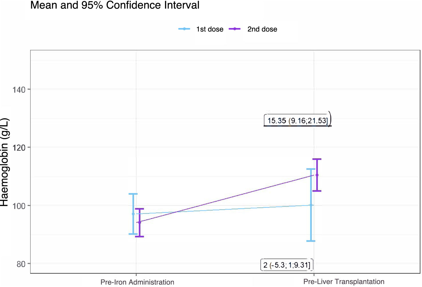 Results296 LT were performed during the study period, 48% of patients had an Hb value <115 g/L. 43 patients made up the study group, in 5 patients the first dose was not administered. The second dose was administered to 55% of patients. No patient presented serious adverse effects or alterations in liver function. Hemoglobin increased compared to baseline by a median of 11.22 g/L (6.47–15.97) after the first administration and 11.64 g/L (6.49–16.78) after the second.