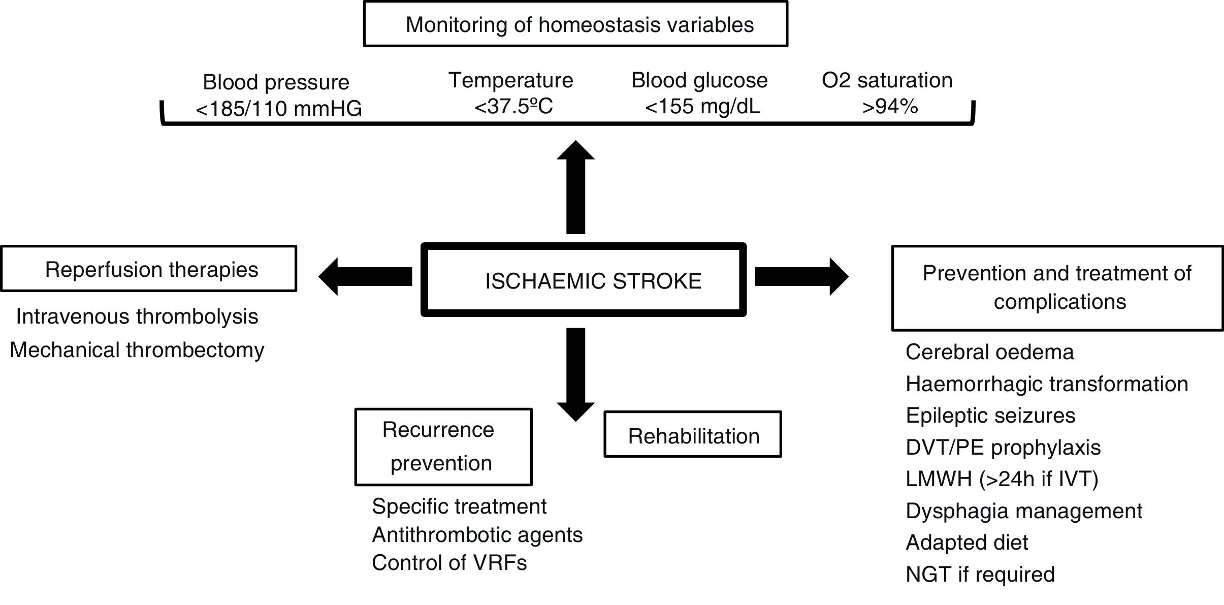 Ischemic stroke is a serious neurological condition that requires urgent attention. As a time-dependent disease, acute stroke management must be coordinated and effective to provide the best treatment as early as possible. The treatment of the acute phase of ischemic stroke includes general measures to ensure patient hemodynamic stability, the use of reperfusion therapies (intravenous thrombolytics and mechanical thrombectomy), improving cerebral protection by monitoring the homeostasis of certain variables as blood pressure, glycemia, temperature, or oxygenation, as well as preventing cerebral and systemic complications. Also, it is necessary an early planning of comprehensive rehabilitation. To prevent early recurrences, control of vascular risk factors and antithrombotic treatment is recommended. The management of patients with acute ischemic stroke aims to reverse initial symptoms, to prevent further brain damage, improve functional outcomes and avoid ischemic recurrences.