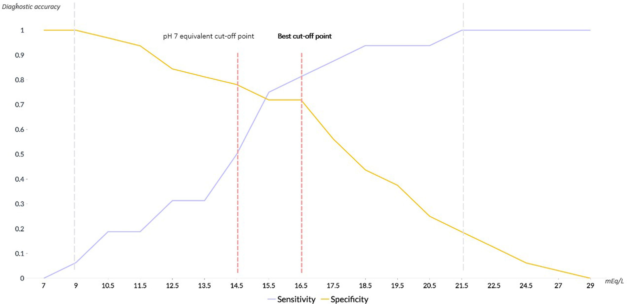 ResultadosEntre 2019 y 2021, 50 pacientes con PCEH fueron incluidos, de los cuales 17 (34%) sufrieron EHI grave. Los valores de pH (6.99±0.20 vs. 7.14±0.15, P=0.007) y HCO3 (14.13±3.24mEq/L vs. 17.97±4.28mEq/L, P=0.003) iniciales, fueron significativamente menores en los pacientes con EHI grave, mientras que no se observaron diferencias en cuanto a la pCO2 (52.44±14.41mmHg vs. 51.38±13.38mmHg, P=0.801). El HCO3 presentó una mayor exactitud para predecir la EHI grave respecto al pH (AUC 0.764 vs. 0.727), siendo el valor de 16.5 mmol/L el mejor punto de corte.