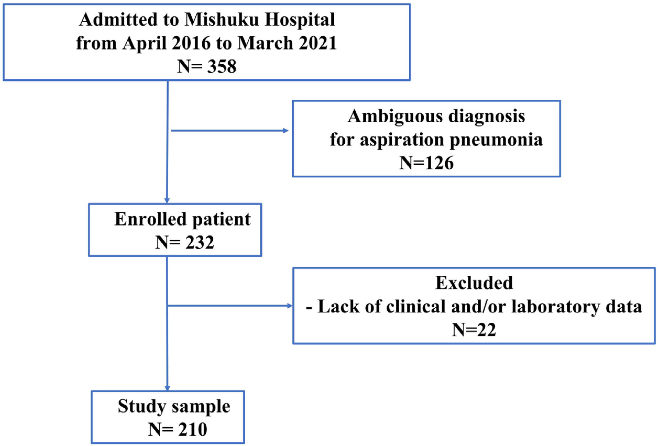 MétodosInvestigamos de forma retroactiva 210 pacientes que acudieron al servicio de urgencias del Hospital Mishuku en Tokio, Japón, y que fueron hospitalizados con neumonía por aspiración.
