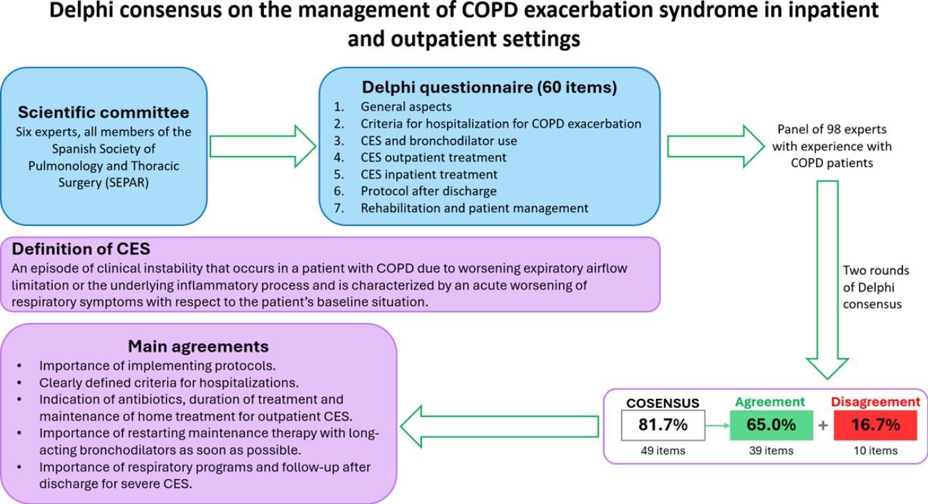 ConclusionsOverall, this Delphi consensus study provides valuable information on the current management of CES, highlighting several areas where consensus remains elusive. While the clinical management of stable COPD is well defined, the treatment of CES presents significant variability. In most of the cases discussed here, the lack of consensus reflects the insufficient scientific evidence available. Therefore, further studies on best clinical practices for COPD patients with CES are needed to standardize treatment protocols. This is essential to improve patient management and improve patient outcomes and quality of life