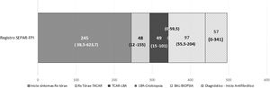 Mediana del tiempo transcurrido desde el inicio de los síntomas hasta el diagnóstico de FPI (días), dividido por el tiempo que transcurre entre la realización de cada una de las técnicas diagnósticas y desde el diagnóstico hasta el comienzo del tratamiento antifibrótico. Las cifras entre paréntesis hacen referencia al rango intercuartílico. Cálculos realizados sobre los 830 pacientes de los que se disponía de información sobre el tiempo desde el inicio de los síntomas hasta el diagnóstico. BIOPSIA: biopsia quirúrgica;