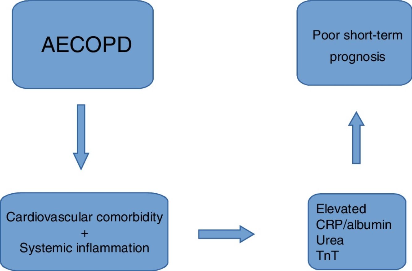 ConclusiónLa elevación de PCR/albúmina, la urea y la TnT son indicadores de mal pronóstico a corto plazo en pacientes ingresados por exacerbación de la EPOC. La comorbilidad cardiovascular y la inflamación sistémica podrían explicar estos hallazgos.