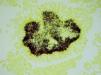 Como factores de riesgo para esta infección se describen el alcoholismo, la mala higiene oral y la alteracio¿n pulmonar estructural, como enfisema o bronquiectasias3. En cuanto al diagnóstico, la tomografía computarizada o la resonancia magnética pueden describir la presencia de una masa irregular de pared gruesa, infiltrante, con una o varias zonas hipodensas centrales que pueden asociarse a fístulas, erosiones o destrucción ósea3. El aislamiento de Actinomyces spp. mediante el cultivo se produce en el 30-50% de los casos, debido a que son bacterias exigentes que requieren medios enriquecidos con CO2 al 6-10%4. La demostración de la presencia de granos de azufre en el pus o en las muestras histológicas es una forma sencilla de diagnóstico4. Estos corresponden a un conglomerado de microorganismos que se forma únicamente in vivo. Pueden ser observados mediante la tinción de hematoxilina-eosina (fig. 1), la tinción de Gram (figs. 2 y 3) o la impregnación con sales de plata (fig. 4). Se puede complementar con tinción de Ziehl-Neelsen (fig. 5) o de Kinyoun para descartar infección por Nocardia spp., las cuales suelen ser parcialmente ácido-alcohol resistentes.