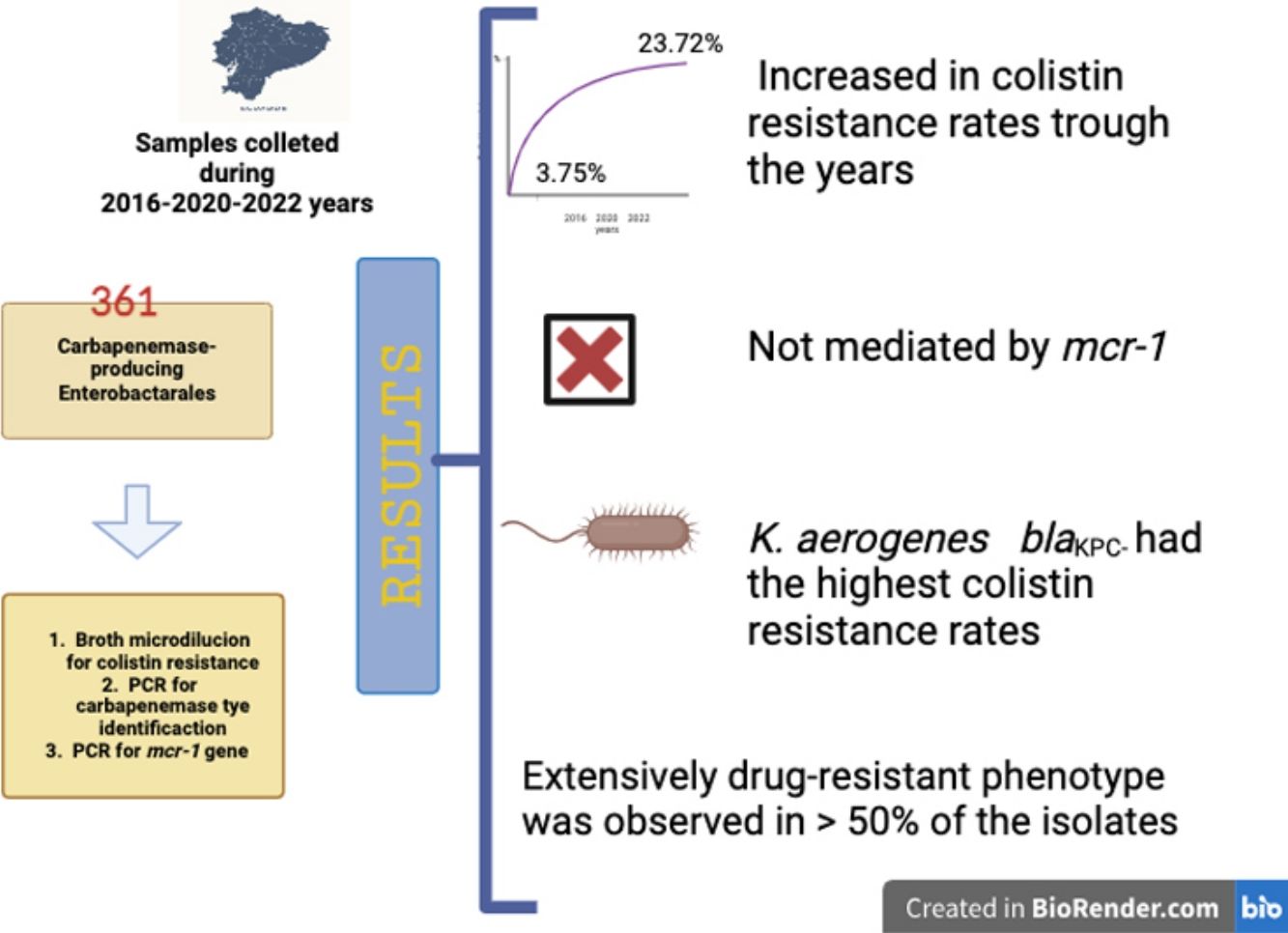 To understand the epidemiology of colistin resistance in the region, this study aims to monitor the mcr-1 gene in CR-CPE in Ecuador, during three time periods from 2016 to 2022.