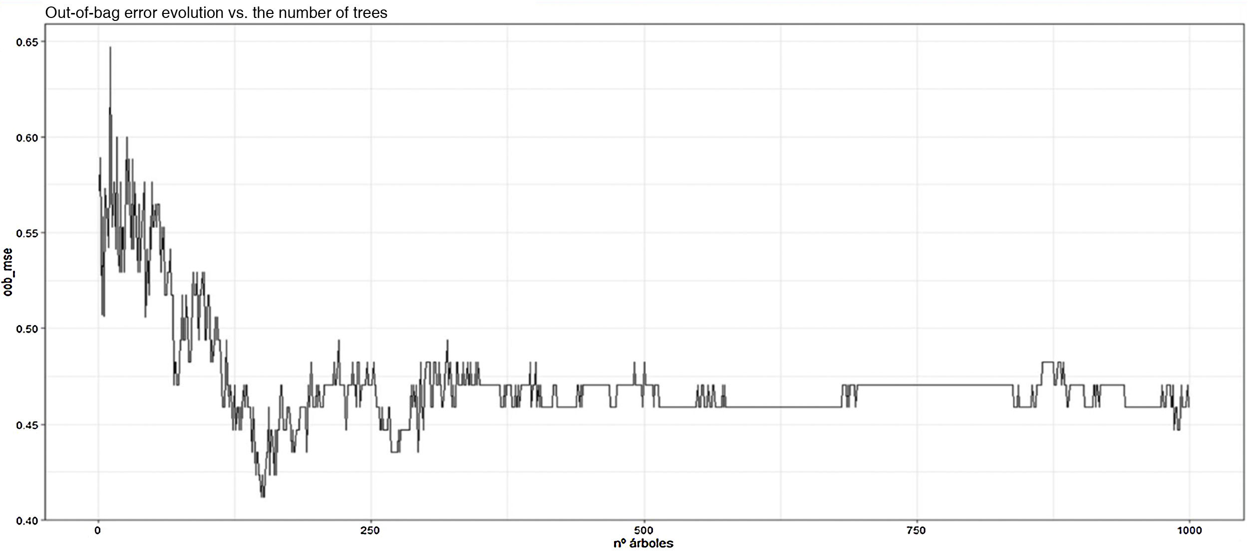 Additionally, the most important variables related to the reduction of mean classification error and purity were explored (see Fig. 3) and it was shown that the variables that most contributed to the prediction model were again: non-scarring alopecia, oral ulcers, and anti-Ro/SSA. In addition, the reduction of the OOB concerning the number of trees and variables was explored (see Fig. 4) and 25 variables with 750 trees were considered for the new Bagging, without major variation in the OOB or in the accuracy of the model.