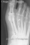Radiological values of the intermetatarsal angle, Hallux valgus or metatarsophalangeal angle (HVA), relative position of sesamoids with respect to the first metatarsal (from 0 to 4) were all determined pre-operatively, in addition to the American Orthopaedic Foot and Ankle Society (AOFAS) rating scale,6,7 as well as their post-operative evolution, at 3 weeks, 6 weeks, 3 months, 1 year, and at the final visit. The angle of the distal metatarsal joint (proximal articular set angle or PASA) was also documented, as were the possible variations on the sagittal plane of the first metatarsal with respect to the second one on a pre- and post-operative standing X-ray. The presence and evolution of existing metatarsalgias, form and cuneometatarsal mobility, difficulty in putting shoes on, and degree of satisfaction were all recorded. The radiographic interpretation of the angles was conducted on standing lateral and anteroposterior projections, both pre- and post-operatively. All measurements are made by computer using the Syngo® (Siemens) computer system, which is the one implemented at our hospital and used to digitalize radiographic projections.