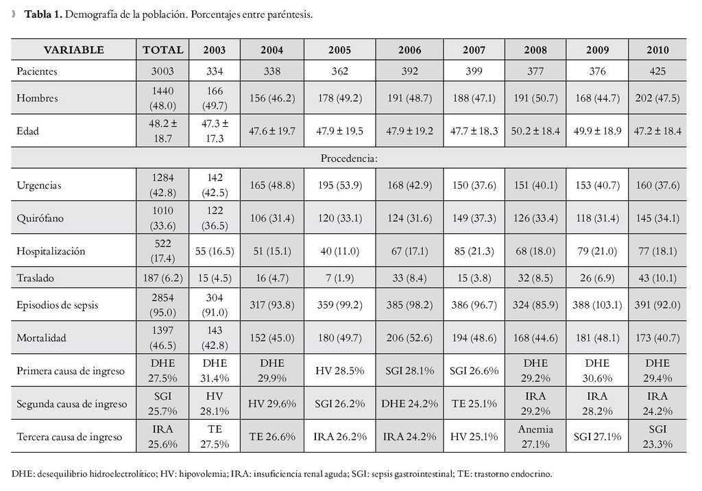 Durante el periodo de estudio ingresaron 3 003 pacientes de los cuales 1 440 fueron hombres (48.0%). La edad media fue de 48.2 ± 18.7 años (13-104 años). La proporción de géneros y la edad promedio se mantuvieron prácticamente estables a lo largo de los años del estudio. Los servicios de procedencia fueron principalmente urgencias y quirófano (Tabla 1). Los tres principales diagnósticos de egreso de la UTI a lo largo de los años se muestran en la Tabla 1, llamando la atención la presencia casi constante de la sepsis abdominal. La mortalidad en total fue de 46.5%, oscilando a lo largo del estudio entre 40.7% y 52.6%.