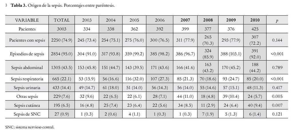 Resultados: De 3 003 pacientes ingresados durante el periodo de estudio, 2 250 sufrieron sepsis, arrojando una tasa de incidencia acumulada de sepsis del 74.9%. Los sitios de origen de la sepsis más frecuentes fueron abdominal (43.5%), respiratorio (22.1%) y urinario (14.4%). Los pacientes sépticos consumieron más recursos que los pacientes sin sepsis: monitoreo hemodinámico invasivo, nutrición parenteral y estancia en la UTI (p<0.05).