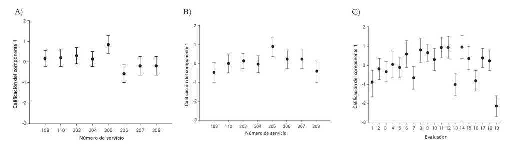 ¿ Figura 1. La gráfica muestra la comparación de promedios del componente principal 1, que corresponde a 78% de la varianza de las calificaciones. Los paneles muestran: A) Calificación por servicio. Se observan diferencias entre el 305 con 306, 307 y 308. B) Cuando la calificación por servicio se ajustó por evaluador hubo menor diferencia entre los servicios. La explicación de esta aparente discrepancia se debe a C) Calificación por valuador. La varianza del componente 1 se debe principalmente a los evaluadores. El servicio 306 fue calificado exclusivamente por el evaluador 19 en 43% de sus evaluaciones. De la misma forma puede observarse que el evaluador 12 hizo 53% de las evaluaciones del servicio 108.