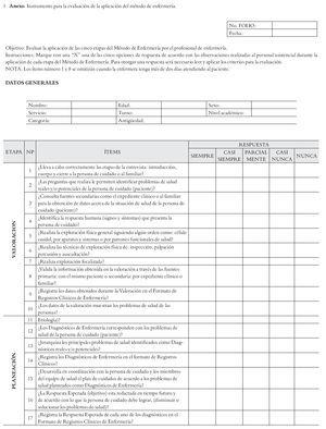 Instrumento: El FIME se diseñó a través de un riguroso proceso, obteniéndose un instrumento de 34 preguntas con base en las cinco etapas del ME. El proceso de tres fases (que se describen en la sección sobre Procedimiento) redujo el número de preguntas del instrumento, pero identificó las principales acciones e intervenciones que debieron ser desarrolladas en cada una de las etapas de la metodología. Estas etapas del ME incluyen valoración, diagnóstico de enfermería, planeación, ejecución y evaluación. En la última fase se aplicó a un grupo de trabajadores de los servicios del HGM en una ocasión, se diseñó como estudio transversal, observacional y prolectivo.13