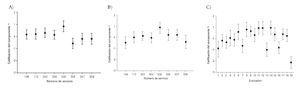 El método que empleamos es con mucho la forma estándar de cómo se validan los instrumentos; sin embargo, agregamos el efecto que tienen los evaluadores. Es común que en los estudios se considere la dispersión de los evaluados y muy poco se hace con los evaluadores. El evaluador tiende a calificar bajo o alto de acuerdo a sus propios estándares. Se intentó disminuir este tipo de error con un curso de capacitación sobre cómo evaluar, esta medida tuvo impacto en la mayoría de evaluadores (Figura 1, panel C).