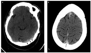 Figura 1 Tomografia computada cranial sense contrast iodat. A. augment de la densitat al si transvers esquerre (fletxes) amb mala definició de les vores, indicatiu de trombe recent. B. Nivell superior. Augment de la densitat al si longitudinal superior (fletxa).