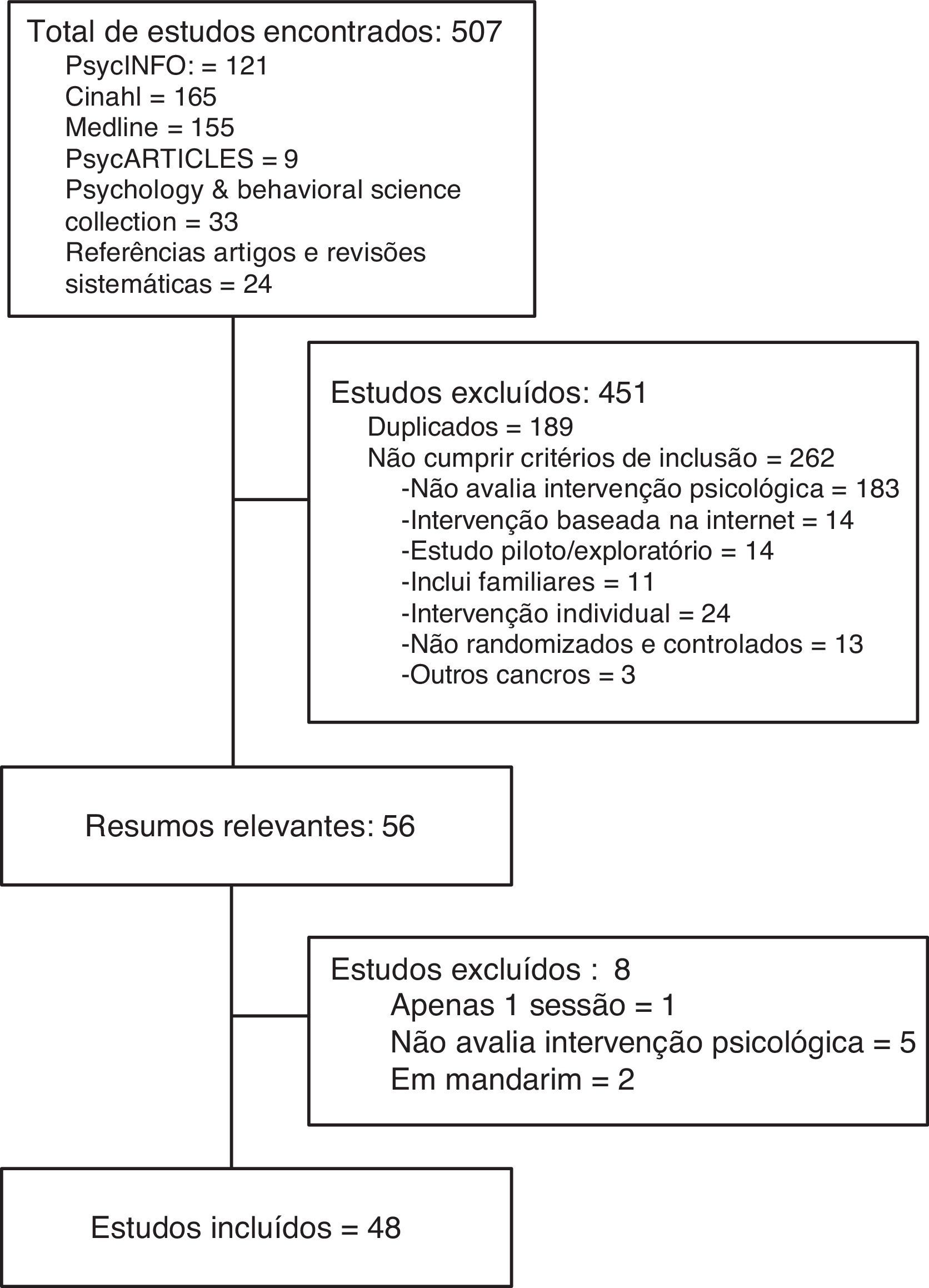 ResultadosA estratégia de busca adotada permitiu a identificação de 507 estudos. Destes, 189 foram automaticamente eliminados por se tratarem de duplicatas (i. e., apresentarem o mesmo título) e 262 foram excluídos por não cumprirem os critérios de inclusão (183 por não avaliarem os resultados da intervenção psicológica, 24 por avaliaram intervenções individuais, 14 por avaliarem intervenções baseadas na internet, 14 por se tratarem de estudos‐piloto, 11 por incluírem familiares ou outros significativos nas intervenções, 13 por não serem estudos clínicos aleatórios e 3 por incluírem outros tipos de cancro). Deste modo, foram selecionados para leitura 56 estudos. Destes, 8 foram excluídos por não cumprirem os critérios de inclusão (5 não avaliam a eficácia de intervenções psicológicas, um é composto apenas por uma sessão de intervenção e 2 estão escritos em mandarim). Deste modo, foram incluídos na revisão 48 estudos25–69,22,70,71 (fig. 1). Uma caracterização detalhada dos estudos de intervenção incluídos na presente revisão sistemática pode ser consultada na tabela 1.