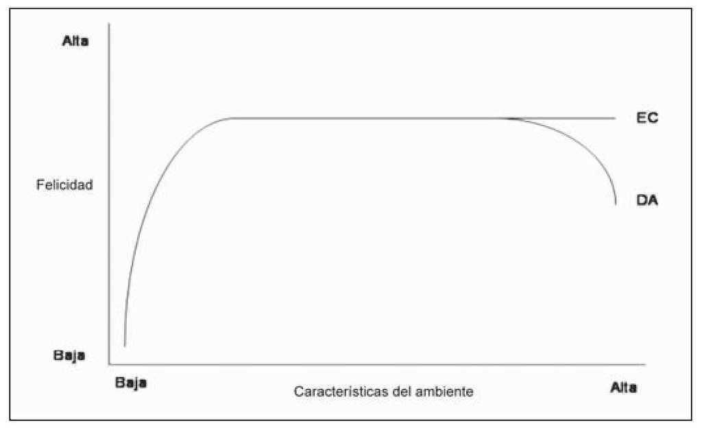 Figura 1. La analogía vitamínica: "disminución adicional" (DA) y "efecto constante" (EC) en las relaciones entre las características del ambiente y la felicidad.