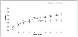 Figure 2. Average rating accuracy (Borman's differential accuracy, BDA) by assessor team size and by assessor background. Higher scores indicate better accuracy. Cell-specific n for single assessors (Students, n = 86; Managers, n = 45). n = 1000 for all cells with a team size of ≥ 2.