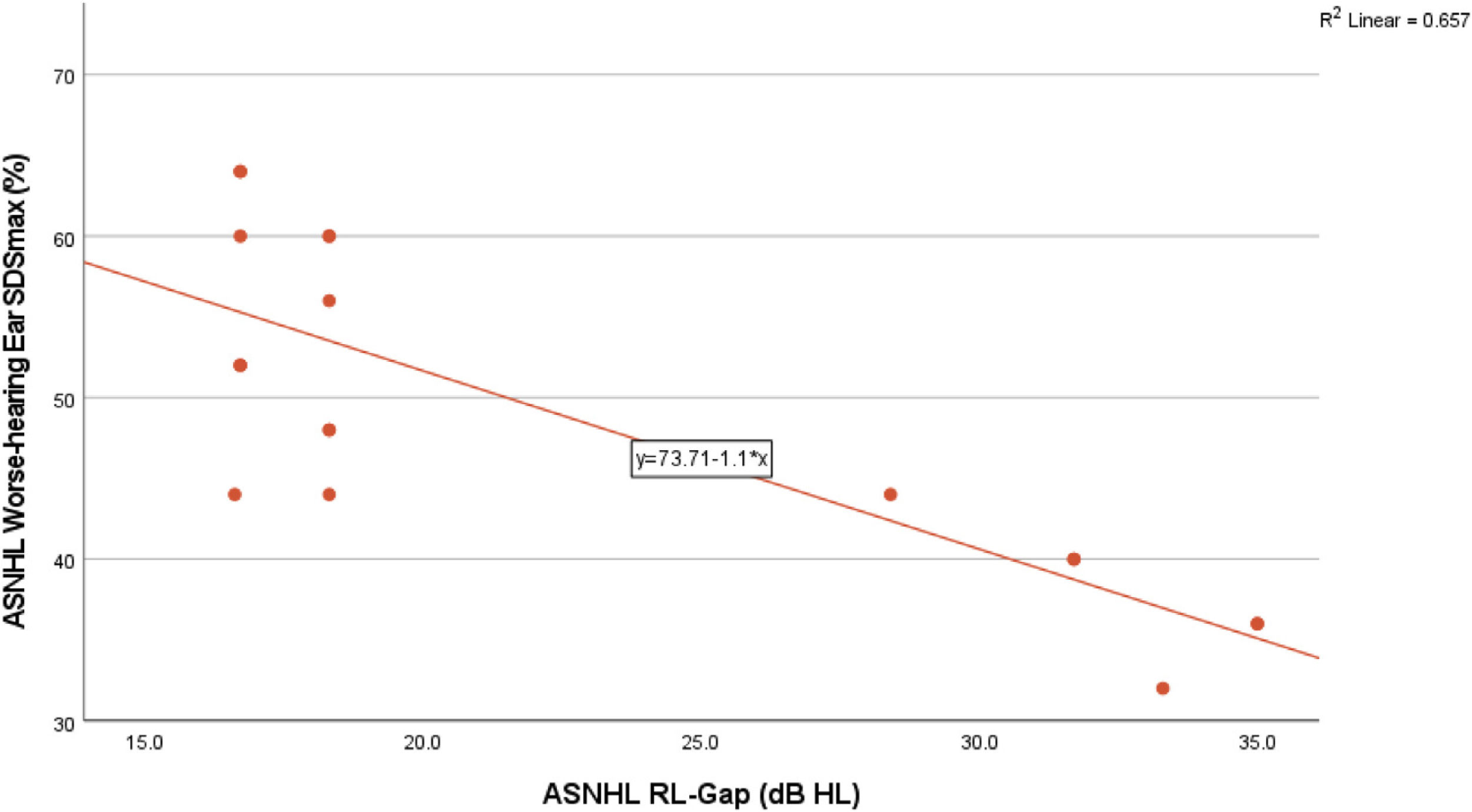 ResultadosEl SDSmax del oído con peor audición en pacientes con ASNHL (48,89 ± 10,13%) fue significativamente menor que en pacientes con SSNHL (69,33 ± 7,97%) con grados de pérdida auditiva comparables. Los pacientes con ASNHL mostraron una mayor disparidad entre los oídos con mejor y peor audición en las puntuaciones del DDT (53,15 ± 13,98%) en comparación con los pacientes con SSNHL (22,96 ± 5,93%). Además, las puntuaciones del BFT en pacientes con ASNHL (55,14 ± 13,30%) fueron significativamente más bajas que en los pacientes con SSNHL (72,92 ± 12,55%).