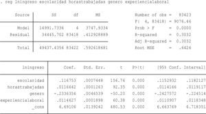 El paquete estadístico utilizado fue Stata; las pruebas referentes a heterocedasticidad y multicolinealidad fueron realizadas con el test de White y el estadístico de “variance inflation factor”, respectivamente. Las pruebas no detectaron problemas en las dos regresiones y los resultados que se muestran a continuación son los obtenidos de la regresión del logaritmo natural del salario (variable dependiente y linealizado por el logaritmo natural) contra la escolaridad, horas trabajadas por semana, género (representado como variable dicotómica, 1= mujer, 2= hombre) y la experiencia laboral, la cual fue calculada como la edad menos la escolaridad, menos seis (los años de educación primaria). El salario siempre es considerado como un parámetro de cómo se comporta el mercado del trabajo en cualquier país, por lo que al elegir escolaridad, horas trabajadas, género y experiencia laboral, podemos no sólo comprobar o rechazar nuestra hipótesis, sino también evaluar qué efectos existen en México al no contar con contratos escritos o vida sindical. Los resultados obtenidos se muestran a continuación.