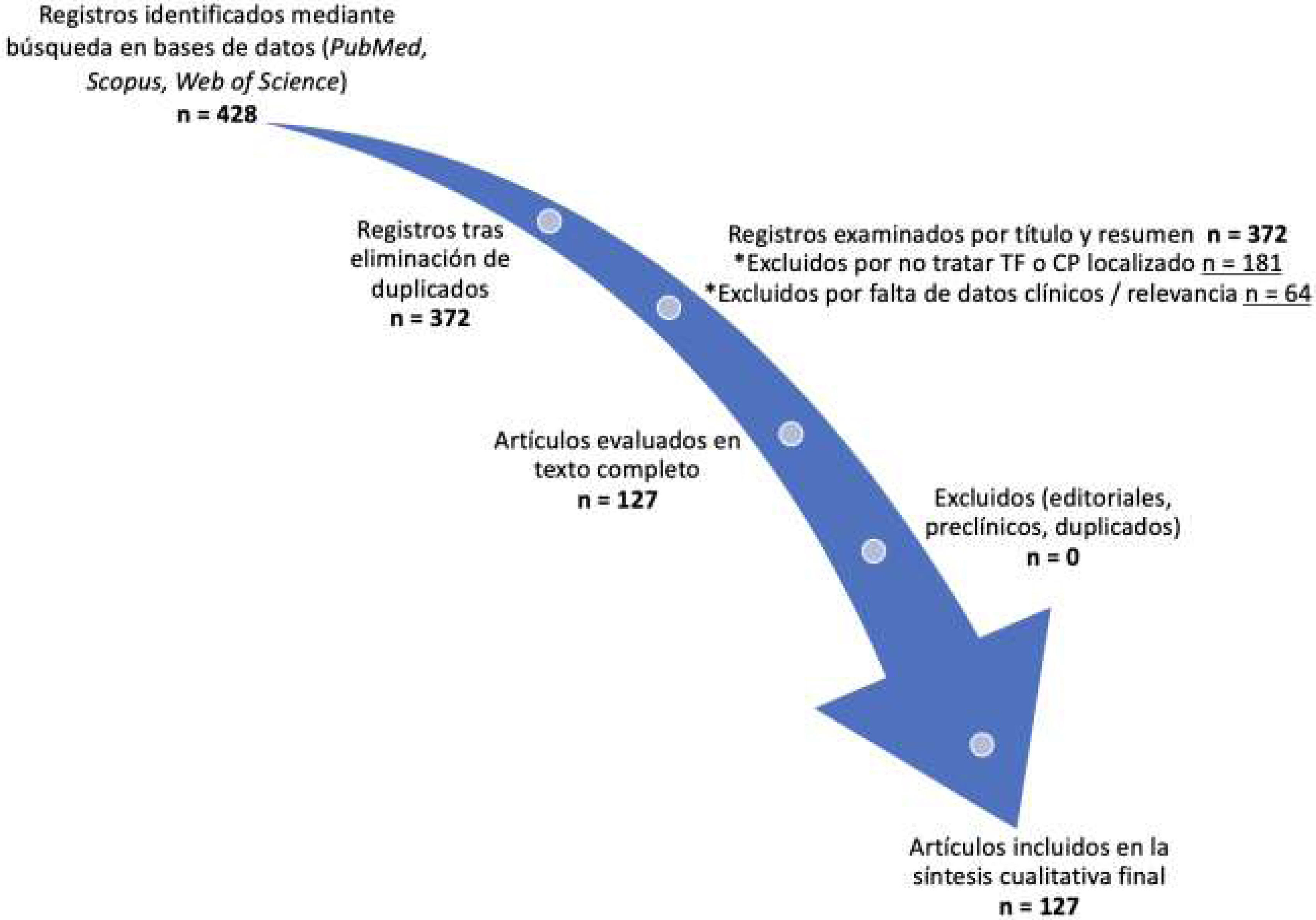 Se identificaron inicialmente 428 registros, de los cuales, tras eliminar duplicados y estudios no relacionados con el tema, se incluyeron 127 artículos en la síntesis cualitativa final. El proceso completo de identificación, cribado y selección de estudios se resume en la figura 1.