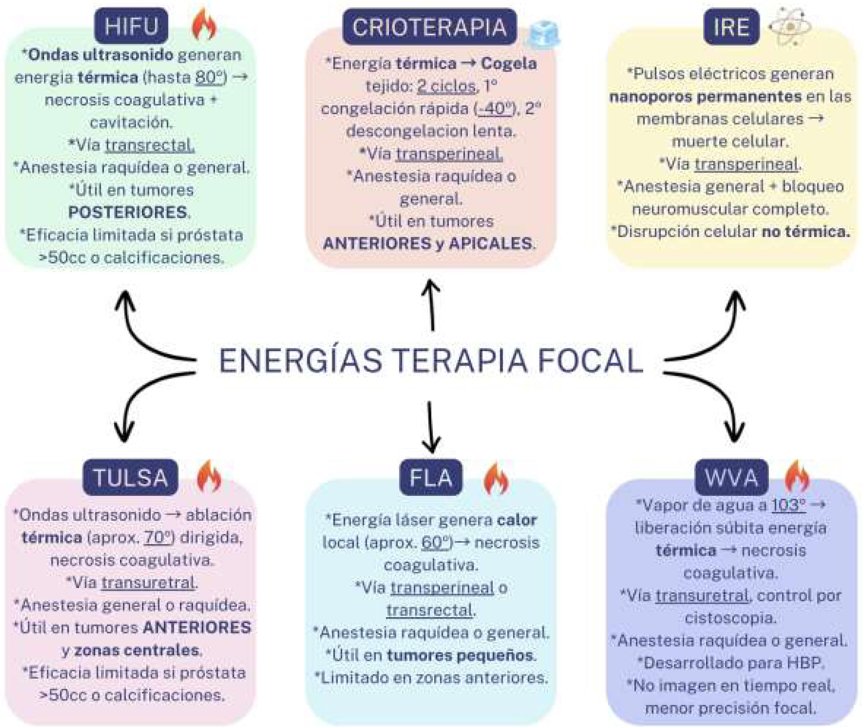 Principales fuentes de energía utilizadas en terapia focal para el tratamiento del cáncer de próstata localizado. Cada modalidad difiere en su mecanismo de acción (térmico vs. no térmico), vía de abordaje, requisitos anestésicos y localización tumoral preferente.