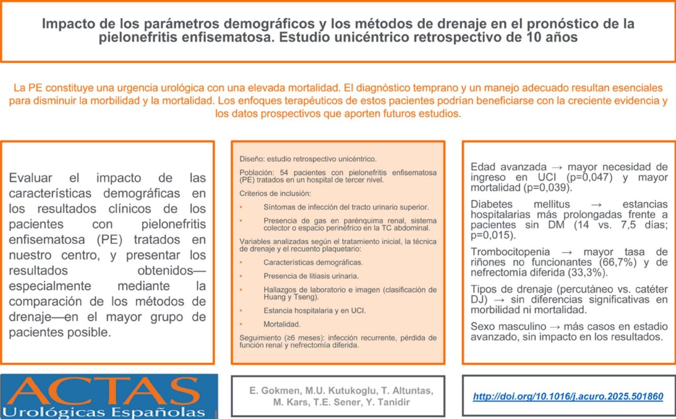 ResultadosLa edad avanzada se asoció con mayor necesidad de ingreso en UCI y mortalidad (p=0,047 y p=0,039, respectivamente). La diabetes se asoció con estancias hospitalarias más prolongadas en comparación con los pacientes sin diabetes mellitus (DM) (14 frente a 7,5 días, p=0,015). La trombocitopenia se relacionó con tasas más elevadas de riñones no funcionantes (66,7%) y de nefrectomía diferida (33,3%). No se encontraron diferencias significativas en cuanto a morbilidad o mortalidad entre los tipos de drenaje (percutáneo o catéter doble J [DJ]). Un mayor número de varones presentó enfermedad en estadio avanzado, aunque esto no influyó en los resultados.