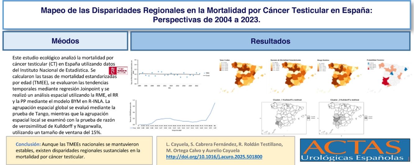 MethodsAn ecological study was conducted using TC mortality data (ICD-10 code C62) from the Spanish National Institute of Statistics (2004-2023). Age-standardized mortality rates were calculated using the direct method. Temporal trends were analyzed with Joinpoint regression. Spatial patterns were assessed using standardized mortality ratios, smoothed relative risk, and posterior probabilities through Bayesian hierarchical models. Spatial clustering was examined with Tango's test and Kulldorff's likelihood ratio test.