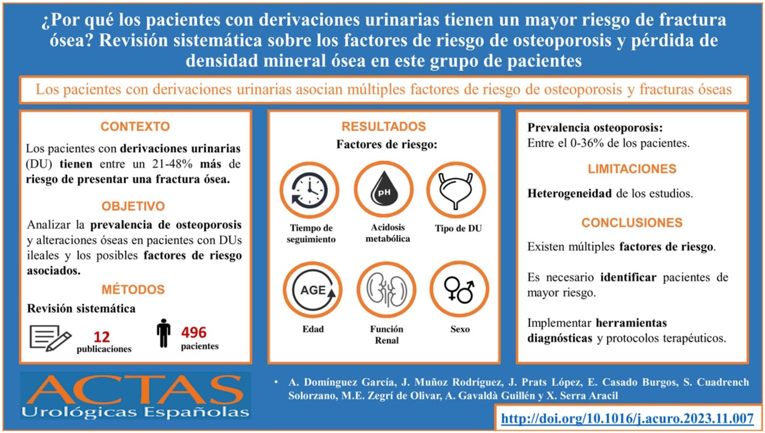 Los pacientes intervenidos de cistectomía radical y portadores de derivaciones urinarias (DU) presentan un mayor riesgo de fractura ósea que la población general. Aunque se ha descrito una pérdida de densidad mineral ósea (DMO) en estos pacientes, todavía se desconoce el mecanismo por el cual siguen esta tendencia.