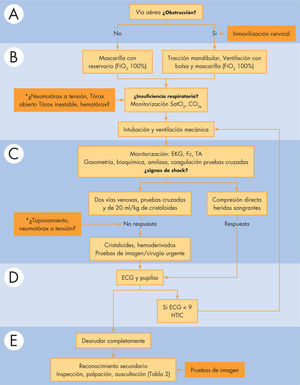 La atención sanitaria inicial del paciente, tanto en el lugar del accidente como la asistencia hospitalaria, debe seguir el esquema de prioridades (tablas 1 y 2) y la secuencia de actuación (algoritmo 1) propuestas por el ATLS12.
