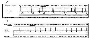 Figure 7. Effect of remifentanil in a patient with digitalis intoxication. Male patient, 64-year-old, weight of 100 kg. He was undergoing to right knee arthroscopy. He had been receiving Lanoxin 0.125 mg daily for several years, Angiotrofin 180 mg one single daily dose, Aspirin 300 mg daily, the latter was suspended one week before surgery. The pre-surgery ECG revealed blockade of the right branch of the Hiss bundle (RBBB) and paroxistic tachycardia, as well as ischemic heart disease; the patient had been implanted three coronary stents in 1994. The upper part, A, of the figure depicts the pre-surgery ECG in which bigeminism was observed. Part B reveals the absence of bigeminism at 4 min after starting remifentanil infusion at 0.15 μg/kg/min.