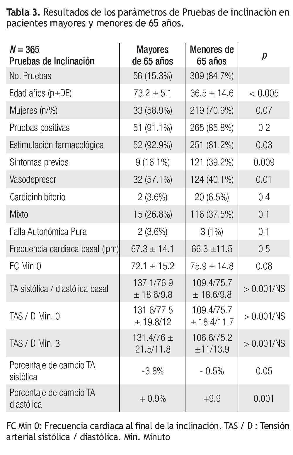 La Tabla 3 muestra los hallazgos de las pruebas de inclinación. Se encontró un aumento ligero en la posibilidad de tener una prueba de inclinación positiva en relación con la edad mayor a 65 años (“Odds Ratio” o Razón de Momios 1.69, IC 95% 0.6 - 4.4).