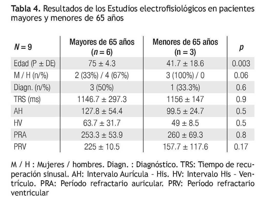 Los hallazgos en los estudios electrofisiológicos se muestran en la Tabla 4. Los pacientes con estudios positivos en mayores de 65 años mostraron 2 bloqueos infrahisianos y un caso de enfermedad bi-nodal (disfunción sinusal y Wenckebach anterógrado a longitudes de ciclo bajas: Bloqueo AV). En el caso del paciente menor de 65 años, se trató de una cardiopatía congénita tipo Ebstein que mostraba parálisis auricular y bloqueo AV completo.14