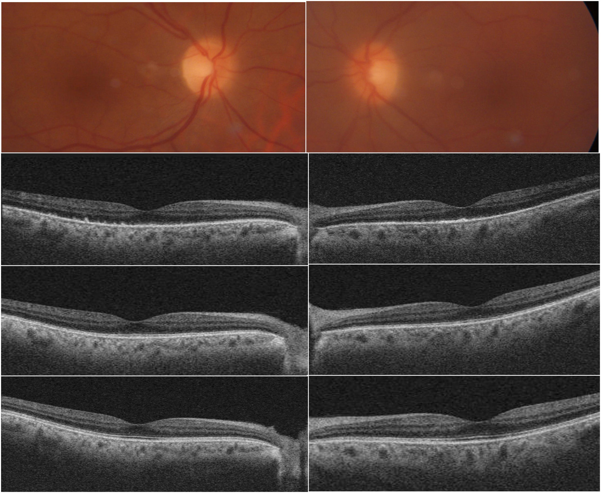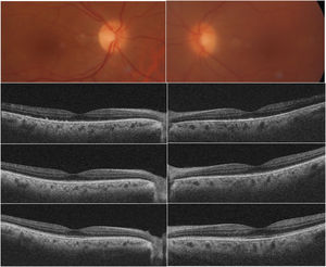 La incidencia de sífilis es creciente. La uveítis sifilítica puede presentarse clínicamente como una retinopatía externa con distintos patrones1. El aspecto en la tomografía de coherencia óptica (OCT) es similar a la retinopatía externa zonal aguda. Desaparece o se interrumpe la línea de los elipsoides y se atenúa la de la MLE. Algunos autores lo denominan elipsoiditis. Es fundamental un diagnóstico y un tratamiento precoces. La recuperación de la estructura íntima de la retina y su función es muy rápida. La imagen de OCT corresponde al momento del debut, 1 y 4 semanas tras iniciar el tratamiento con penicilina (fig. 1).