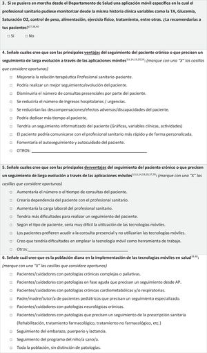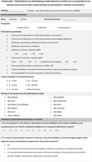 Recolección de datosLos participantes fueron reclutados a través de los coordinadores de las ZBS, quienes propusieron su participación a los profesionales que cumplían los criterios de inclusión. Para analizar las variables objeto del estudio, los participantes rellenaron un formulario anonimizado ad hoc (Anexo 1), basado en datos obtenidos en las últimas guías oficiales y la evidencia publicada3,5,6,14,17-24. Este constó de dos apartados: uno de datos sociodemográficos (edad, sexo, ZBS, formación y experiencia en AP) y otro con siete preguntas sobre el uso de mHealth e internet en AP. La primera evaluó la habilidad y el manejo de aplicaciones móviles y se desarrolló ad hoc utilizando una escala Likert (1-10), debido a la falta de instrumentos validados en español específicos para la evaluación de las competencias digitales en los profesionales sanitarios. Además, se incluyeron otras seis preguntas de opción múltiple sobre la aplicación de la mHealth en AP, ventajas y desventajas en el seguimiento de pacientes crónicos, destino del uso de aplicaciones, prescripción en internet y aceptabilidad de la mHealth. Se estimó un tiempo de cumplimentación de 15minutos. Para garantizar el anonimato, se asignó a cada participante un código único compuesto por sus iniciales y las dos últimas cifras de su año de nacimiento, asegurando la confidencialidad en el tratamiento de sus respuestas.
