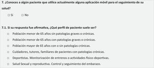 MedicionesSe creó un formulario ad hoc anonimizado dividido en dos apartados: datos sociodemográficos y 7 preguntas sobre el uso de tecnologías de salud móvil e internet.
