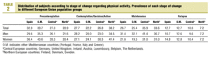 Greece had the highest prevalence of stages resistant to change, and we therefore decided to analyze this country separately. In Greek men the OR for static stage was 2.55 (95% CI, 1.92-3.39) in comparison to Spanish men. Men older than 45 years were more likely to be in a static stage than men aged 15 to 24 years (OR, 1.88 for men aged 45-54 years, OR, 1.97 for men aged 55-64 years, and OR, 2.96 for men aged 65 years and older).