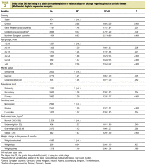 The findings for women were similar. Women in Greece and other Mediterranean countries were more likely than Spanish women to be in a static stage for physical activity, whereas static stages were less prevalent in women living in northern and central Europe.