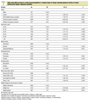 Tables 3 and 4 show the results of the multivariate analysis, expressed as odd ratios (OR)28 for being in a static stage (precontemplation or relapse) regarding physical activity.