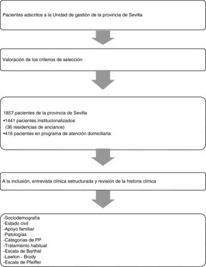 Material y métodosEstudio observacional descriptivo transversal multicéntrico. Se llevó a cabo en el año 2016, en la provincia de Sevilla. La muestra estaba constituida por 1.857 pacientes ancianos de características similares, de los cuales 1.441 se encontraban institucionalizados y 416 en el programa de atención domiciliaria. Las residencias de ancianos del estudio (un total de 36), de carácter público y privado, estaban adscritas a Unidades de Gestión Clínica (UGC) de la red docente de la Unidad Docente de Medicina Familiar y Comunitaria de Sevilla. Los adscritos en el programa de Atención Domiciliaria AP pertenecían a la misma zona de dichas residencias. El tamaño de la muestra se ha estimado a través de la calculadora estadística OpenEpi, versión 3.01, con una potencia al 80% y un nivel de significación de ambos lados del 95%. El tamaño muestral obtenido fue 450 (Kelsey et al.3); la razón de expuestos/no expuestos fue de 1, y se establece por consenso una prevalencia del 10%. El cálculo del tamaño muestral se basa en la validación del estudio PROFUND en pacientes pluripatológicos en AP4.
